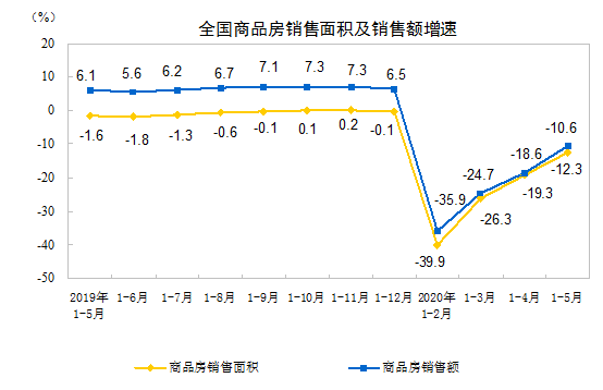 1—5月份,商品房销售面积48703万平方米,同比下降12.3%,降幅比1—4月份收窄7.0个百分点。其中,住宅销售面积下降11.8%,办公楼销售面积下降26.7%,商业营业用房销售面积下降21.7%。商品房销售额46269亿元,下降10.6%,降幅比1—4月份收窄8.0个百分点。其中,住宅销售额下降8.4%,办公楼销售额下降35.3%,商业营业用房销售额下降26.6%。