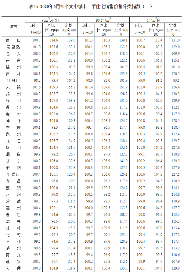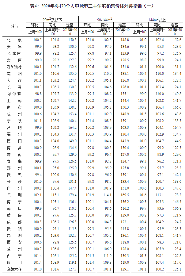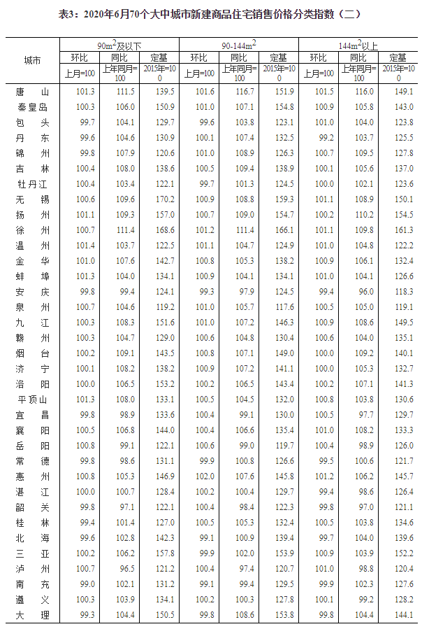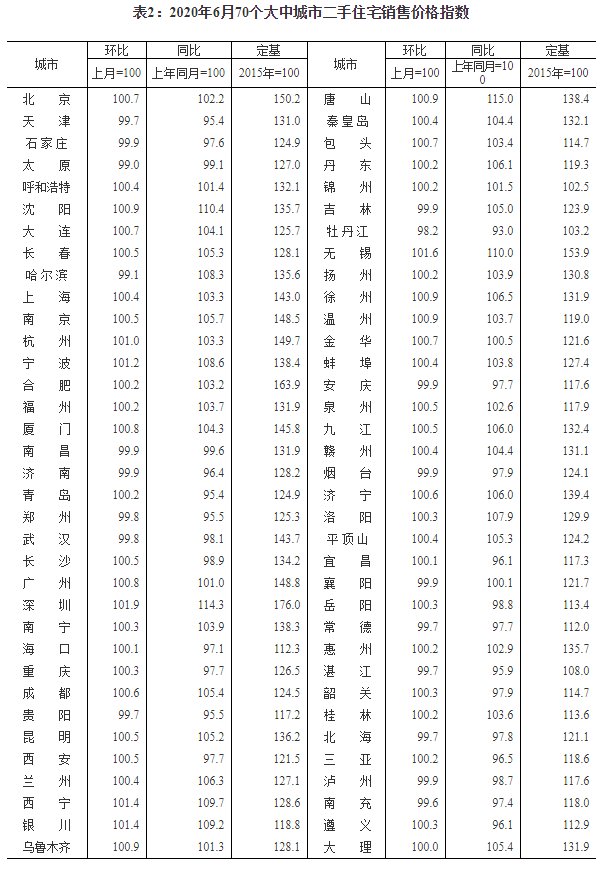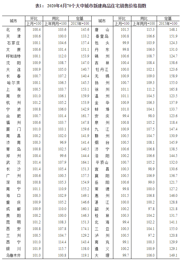 2020年6月份70个大中城市商品住宅销售价格变动情况