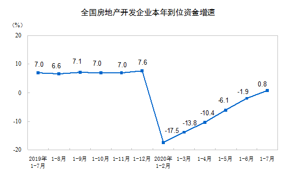 1—7月份,房地产开发企业到位资金100625亿元,同比增长0.8%,1—6月份为下降1.9%。其中,国内贷款16130亿元,增长4.9%;利用外资80亿元,增长29.9%;自筹资金32042亿元,增长3.3%;定金及预收款32830亿元,下降3.4%;个人按揭贷款16200亿元,增长6.6%。