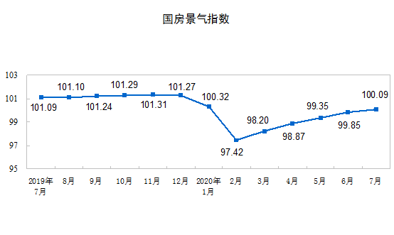 7月份,房地产开发景气指数(简称“国房景气指数”)为100.09,比6月份提高0.24点。