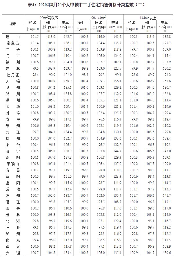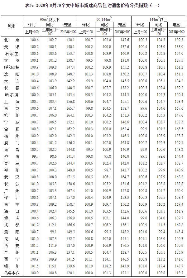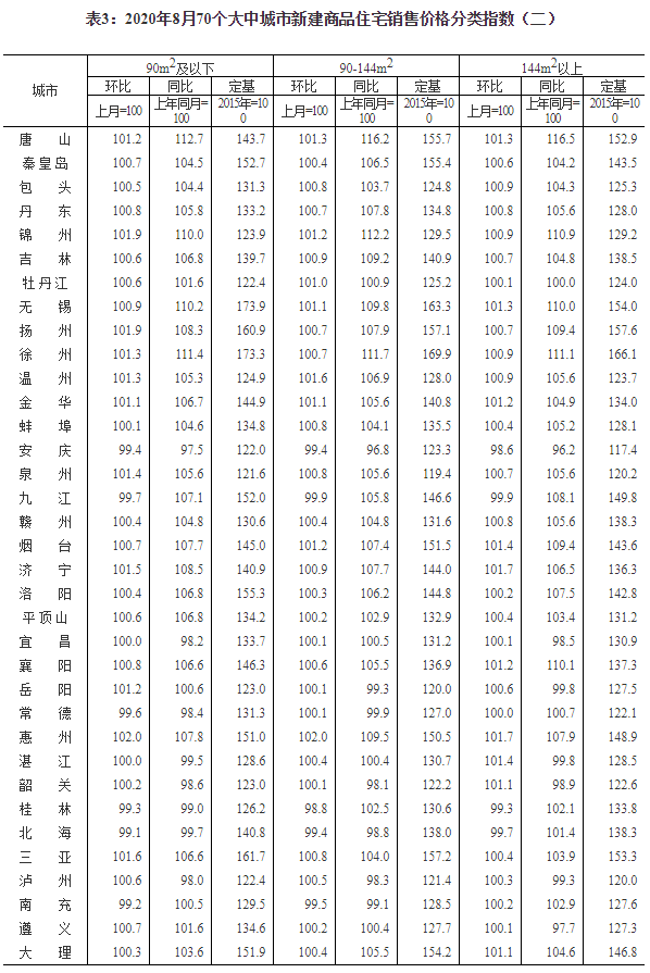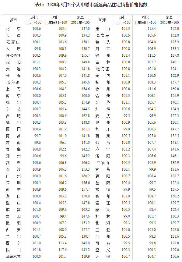 2020年8月份70个大中城市商品住宅销售价格变动情况