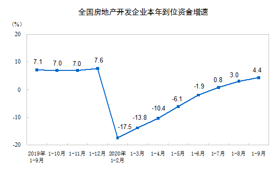 1—9月份,房地产开发企业到位资金136376亿元,同比增长4.4%,增速比1—8月份提高1.4个百分点。其中,国内贷款20484亿元,增长4.0%;利用外资94亿元,下降9.5%;自筹资金44485亿元,增长5.9%;定金及预收款45145亿元,增长2.9%;个人按揭贷款21783亿元,增长9.5%。