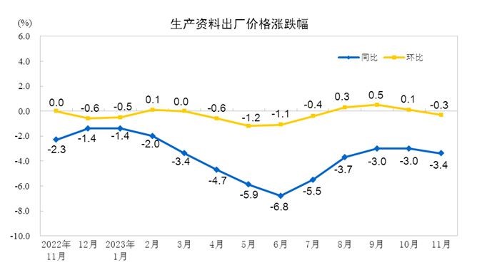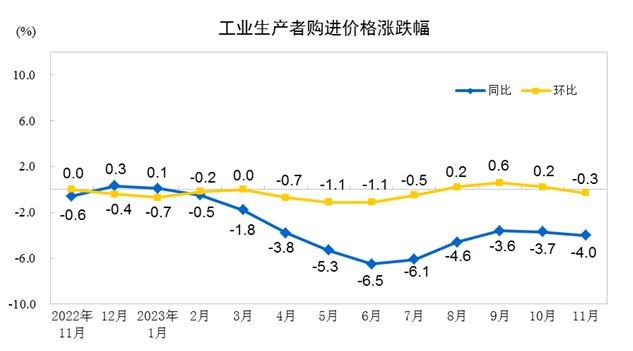 2023年11月份,全国工业生产者出厂价格同比下降3.0%,环比下降0.3%;工业生产者购进价格同比下降4.0%,环比下降0.3%。1—11月平均,工业生产者出厂价格比上年同期下降3.1%,工业生产者购进价格下降3.6%。