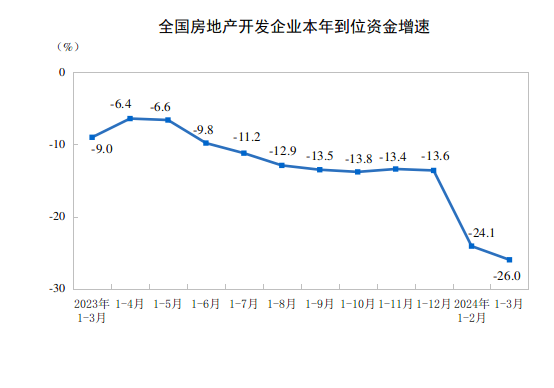 1—3月份,房地产开发企业到位资金25689亿元,同比下降26.0%。其中,国内贷款4554亿元,下降9.1%;利用外资7亿元,下降11.9%;自筹资金8681亿元,下降14.6%;定金及预收款7435亿元,下降37.5%;个人按揭贷款3643亿元,下降41.0%。