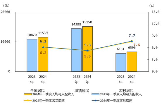一季度,全国居民人均可支配收入11539元,比上年同期名义增长6.2%,扣除价格因素,实际增长6.2%。分城乡看,城镇居民人均可支配收入15150元,增长(以下如无特别说明,均为同比名义增长)5.3%,扣除价格因素,实际增长5.3%;农村居民人均可支配收入6596元,增长7.6%,扣除价格因素,实际增长7.7%。