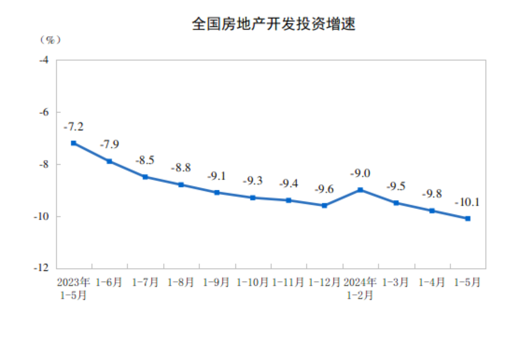 1—5月份,全国房地产开发投资40632亿元,同比下降10.1%(按可比口径计算,详见附注6);其中,住宅投资30824亿元,下降10.6%。